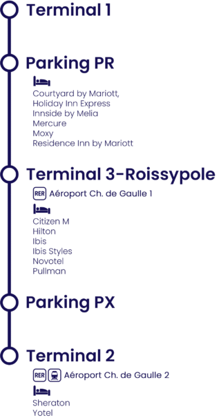 Follow the appropriate CDGVAL signage to Terminal 1, 2, 3 or to car parks PR and PX.