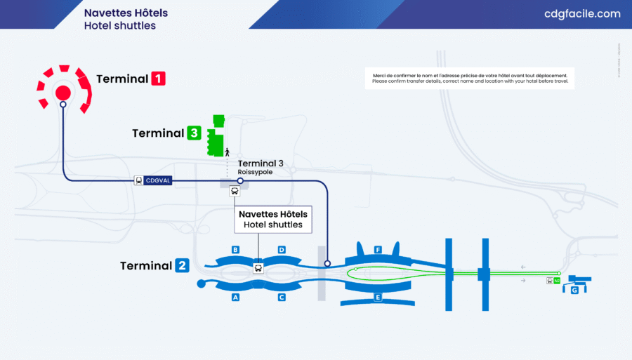 Nearby Hotels – in the surrounding neighborhoods of CDG Airport – are accessible via complimentary hotel shuttle services. Some establishments may charge a fee of €3 to €10 per person, and advance reservation may be required.