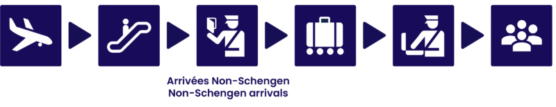Follow the Exit-Baggage signs upon arrival. If you are arriving on a non-Schengen flight, you will need to go through passport control. After collecting your baggage, you will pass through French Customs before entering the public arrivals area.