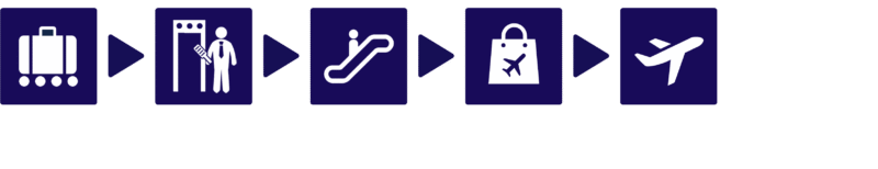 After check-in and baggage drop, proceed to the end of the hall following the Boarding signs. Pass through security check, then take the escalator to the upper level.