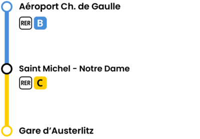 Take RER Line B to Saint Michel-Notre Dame (all trains stop there), then transfer to RER line C towards Gare d’Austerlitz (in the direction of Massy-Palaiseau, Dourdan, or Saint-Martin-d’Étampes).
